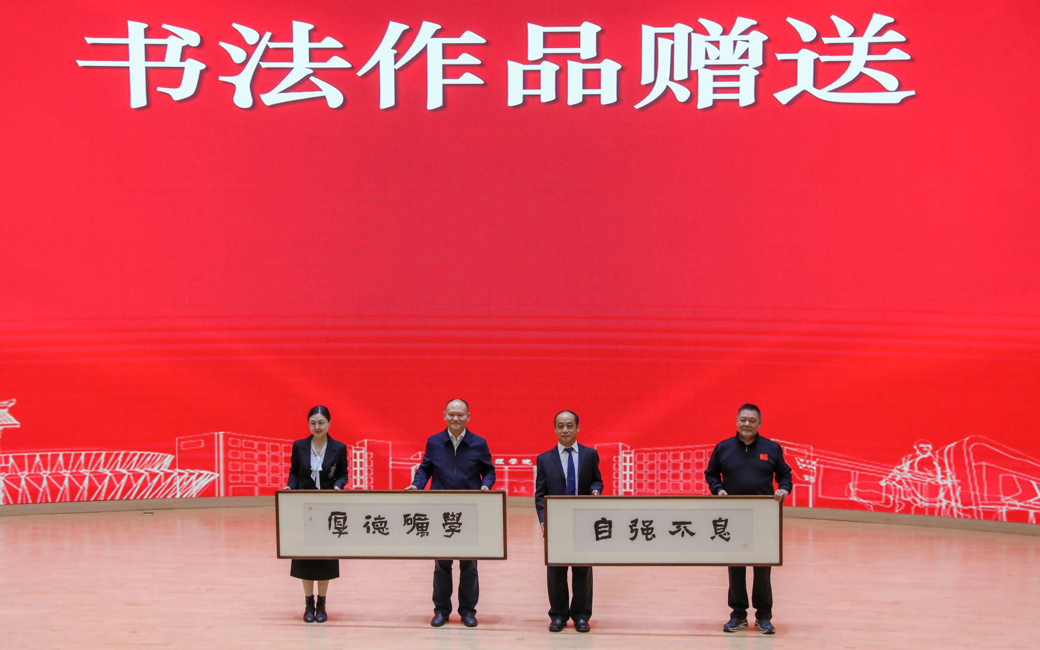 会议由体育学院党委书记罗润锋主持。机关党委书记兼组织部副部长于响生宣读校党委文件,1982级体育班校友黄小军、1983级体育班向体育学院赠送书法作品。
