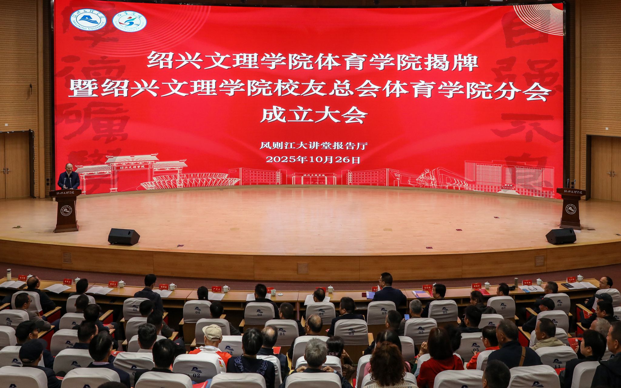 10月26日上午,绍兴文理学院校友总会体育学院分会成立大会在风则江大讲堂报告厅举行。校长赵阳,副校长陈均土,校党委委员、宣传部部长宋浩成,政府部门、兄弟高校和地方企业代表浙江体育职业技术学院校长孟关良,绍兴市体育局副局长严青云,上海体育大学体育教育学院院长张庆文,台州学院体育学院党委书记林辉杰,嘉兴大学体育与军训部主任、直属党支部书记朱小烽,湖州师范学院体育学院执行院长刘炼,浙江大学教育学院副院长黄聪,温州大学体育与健康学院副院长赵海波,浙江师范大学体育学院副院长关志逊,丽水学院副院长张艳超,杭州师范大学民传系副主任杜银玲,浙江古越龙山绍兴酒销售有限公司董事长、总经理朱国安等,以及学校职能部门负责人代表、体育学院历年毕业校友代表、在体育学院工作过的领导老师和在校师生200余人参加了本次会议。