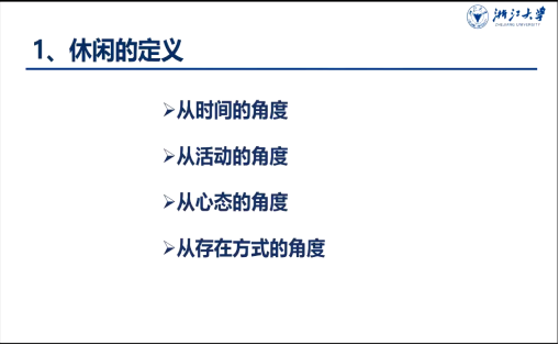 邱老师从多种角度对休闲的概念进行了诠释,并根据Stebbins的深度休闲理论介绍了休闲的分类,即随兴休闲、主题计划休闲和深度休闲。她细致的讲解深度休闲的六个特征,并结合浙江大学休闲团队的前期成果详细介绍了深度休闲与幸福感、成功老龄化的关系。