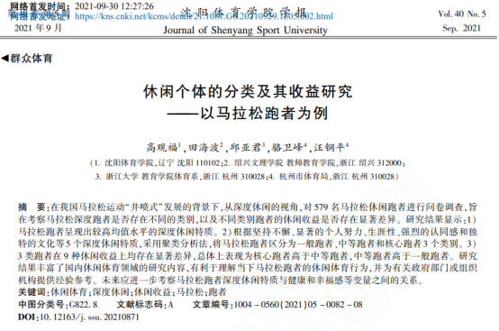 以上论文是在国家社科基金(16BTY077)和绍兴文理学院科研启动经费(20216011)的资助下完成的。论文主要以“马拉松”和“骑行”的休闲参与者为例,根据人们在休闲体育参与过程中的涉入程度,通过构建研究假设模型,考察深度休闲、游憩专门化、休闲满意度、成功老龄化和孤独等变量之间的关联。研究结果有助于理解人们的休闲体育行为背后的影响机制,同时为有关政府部门、体育协会和休闲个体提供经验参考。