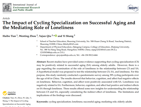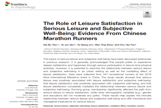 绍兴文理学院体育系、绍兴文理学院田径队教练田海波老师,自2021年入职以来,以第一作者身份,在SSCI来源期刊Frontiers in Psychology、International Journal of Environmental Research and Public Health上发表论文“The Role of Leisure Satisfaction in Serious Leisure and Subjective Well-Being: Evidence From Chinese Marathon Runners”、“The Impact of Cycling Specialization on Successful Aging and the Mediating Role of Loneliness”。另外,于2021年9月以通讯作者身份,在CSSCI核心期刊《沈阳体育学院学报》上发表论文《休闲个体的分类及其收益研究——以马拉松跑者为例》。
