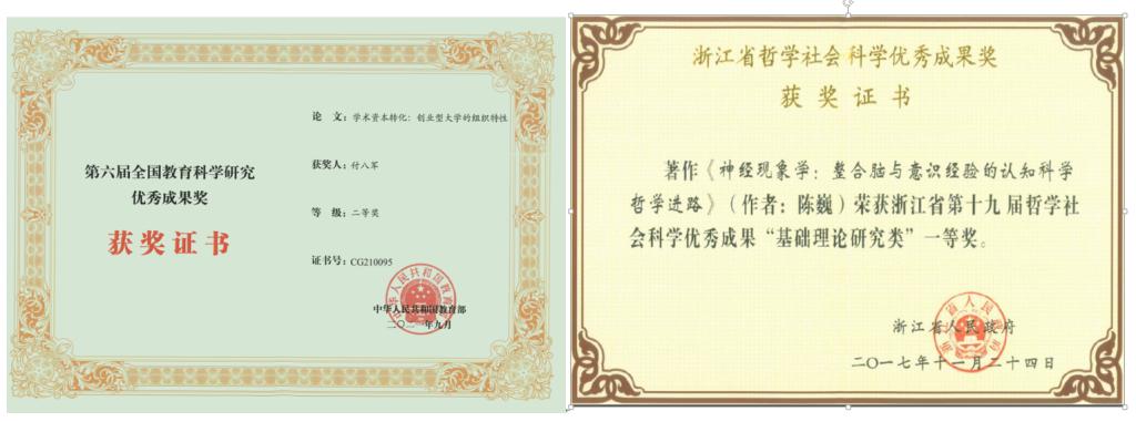 近五年来,学院教师在PNAS、elife、Brain Structure and Function、Current Psychology、The Journal of Genetic Psychology、《教育研究》《哲学研究》《心理学报》《新华文摘》《科学通报》《高等教育研究》《课程教材教法》《比较教育研究》《华东师范大学学报(教育科学版)》等权威和核心期刊发表论文300余篇,其中SSCI、SCI、A&HCI论文40余篇,CSSCI论文90余篇,出版专著20余部,在中国社会科学出版社、高等教育出版社等出版教材10余部,主持和参与国家级、省部级各类课题近百项,成功立项浙江省哲学社会科学规划重大项目3项。获全国教育科学研究优秀成果二等奖1项,省哲学社会科学成果一等奖、三等奖各2项、青年奖1项;美国教育学教授学会优秀图书提名奖1项;省级教学成果一等奖1项、二等奖3项。